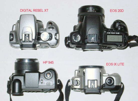 It's small. I know the specifications give you the size, but there's nothing like picking up the camera and holding it. In fact for me it's on the verge of being too small. Now I'm a 6ft male, so my hands are, I guess, fairly large. If I was a 5ft female, maybe the size would be perfect. The image below shows the Digital Rebel XT compared to several other cameras: