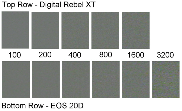 Here's a set of images showing noise levels at various ISO settings, from 100-1600 for the Digital Rebel XT and from 100-3200 for the EOS 20D. These are shots of a gray card and each is a 100% crop from the center of the image.